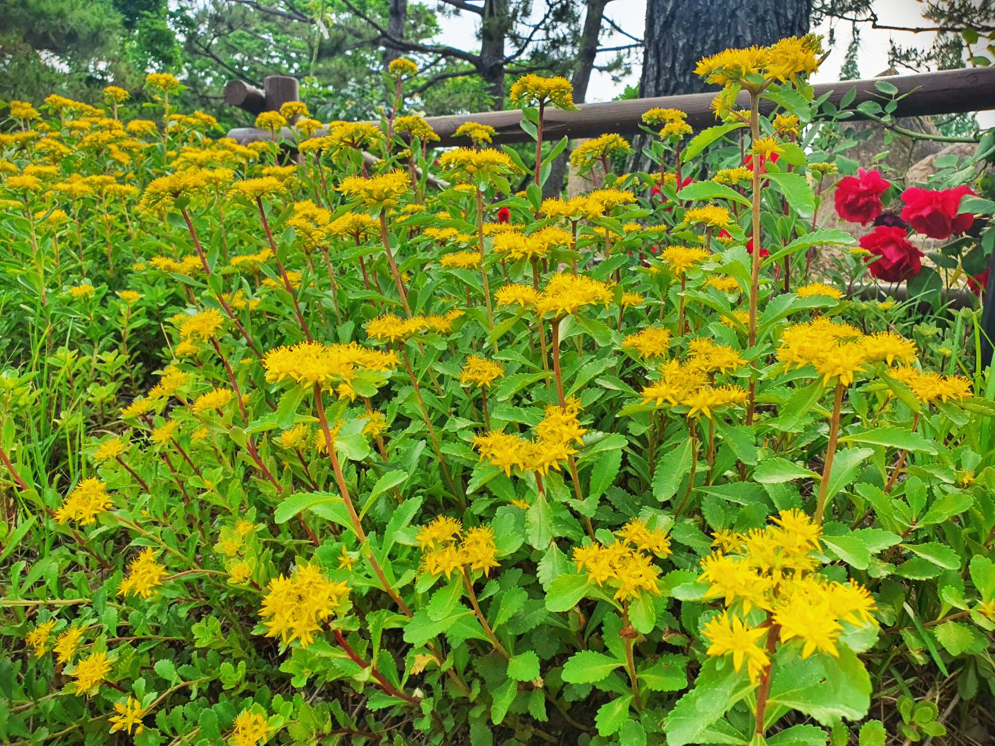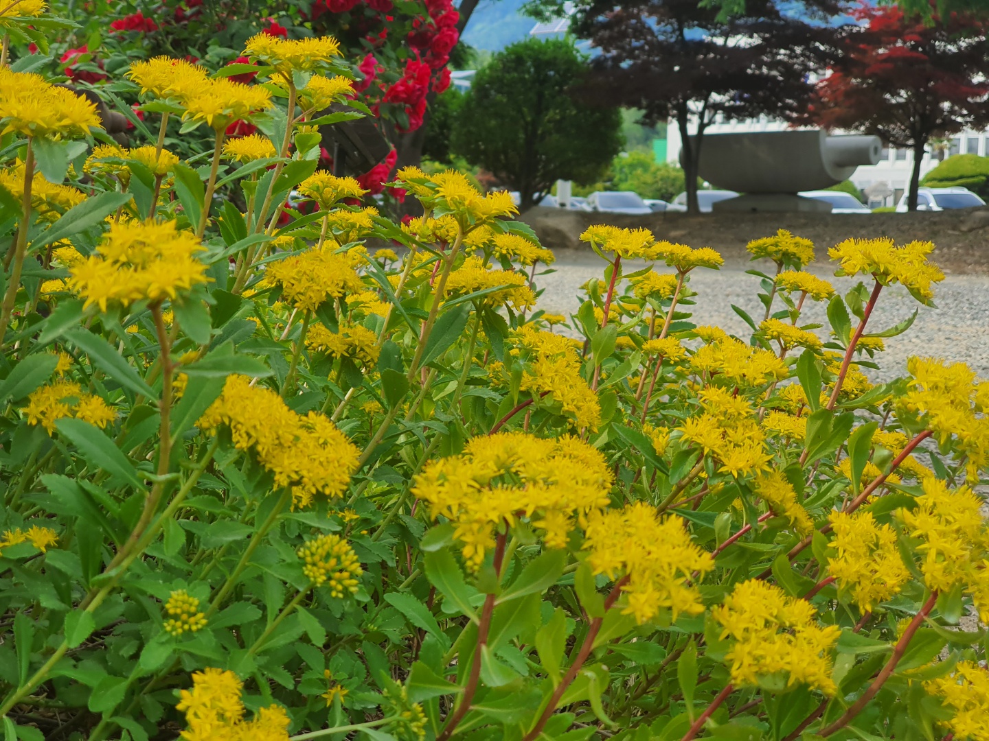 여름이 너무 빨리 와 꽃들이 지기 시작한 느낌입니다. 그중 파릇파릇 꽃을 피우는 녀석을 소개합니다. 이제 꽃을 피우는 중입니다. 기린초라는 돌나물과 식물입니다. 노란색 꽃을 막 피우기 시작했습니다.