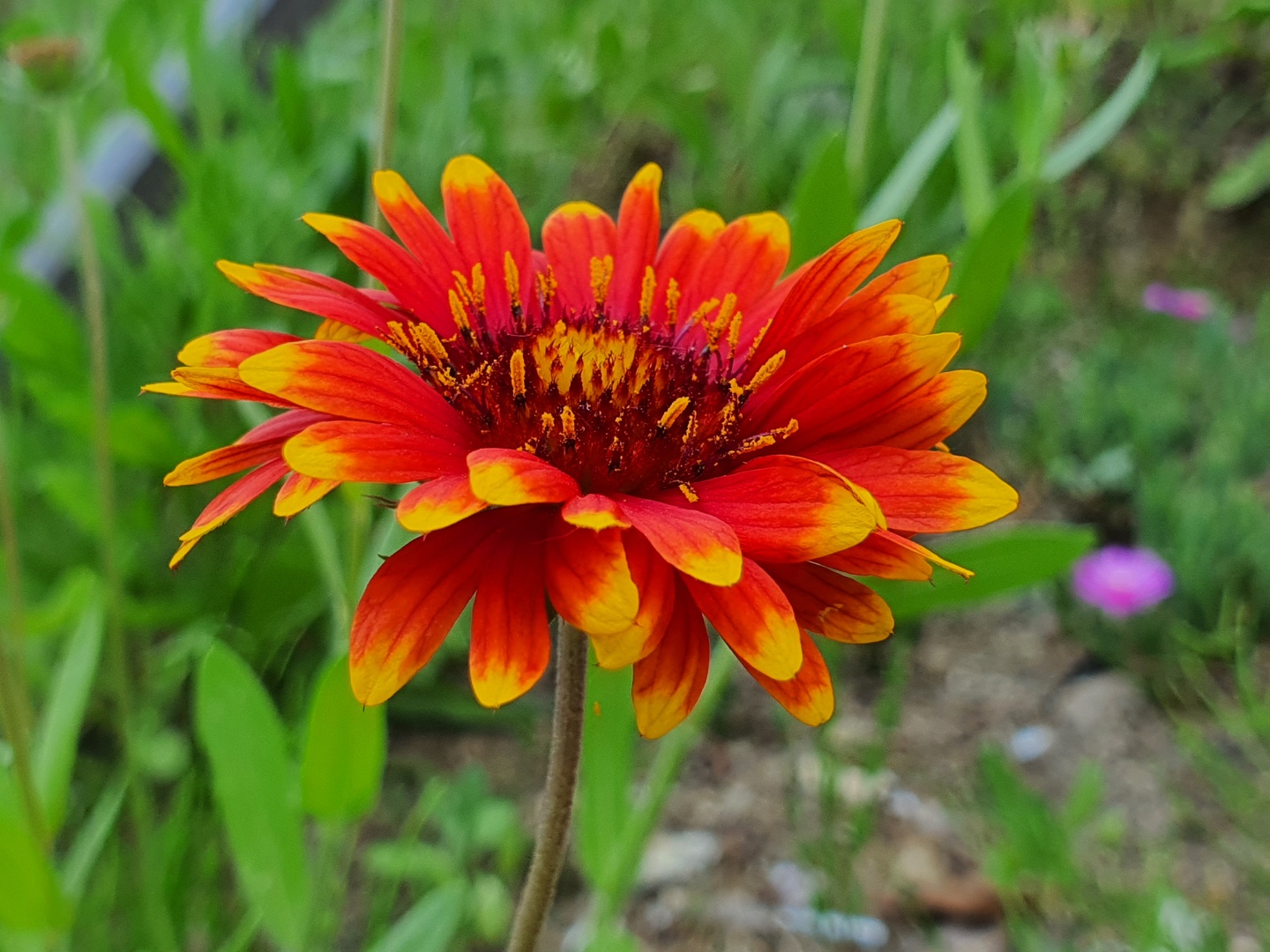 천인국은 품종이 많아 모양과 색깔, 피는 시기와 개화기간도 제각각입니다. 산책길에 본 천인국은 4월 말부터 피기 시작해 6월인 지금도 여전히 피어 있습니다. 천인국은 키가 30~50cm 정도, 꽃의 크기도 5~8cm 정도로 크고 안쪽은 붉은색 바깥은 노란색인 국화과의 한해살이 풀입니다. 줄기는 한해살이지만 뿌리는 노지 월동이 가능해 다음 해 다시 꽃을 피웁니다.