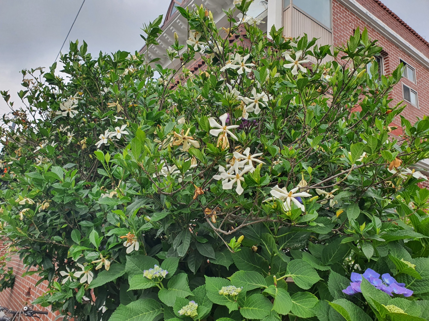 치자나무는 보기 힘들 거라는 예상과 다르게 어느 집 정원에서 간혹 볼 수 있는 조금 흔한 나무입니다. 단무지 만들 때 노란색을 내기 위해 치자열매를 사용했다는 말이 떠오릅니다. 치자나무 열매는 노란색을 낼 때 사용하거나 한약재로도 쓴다고 합니다.