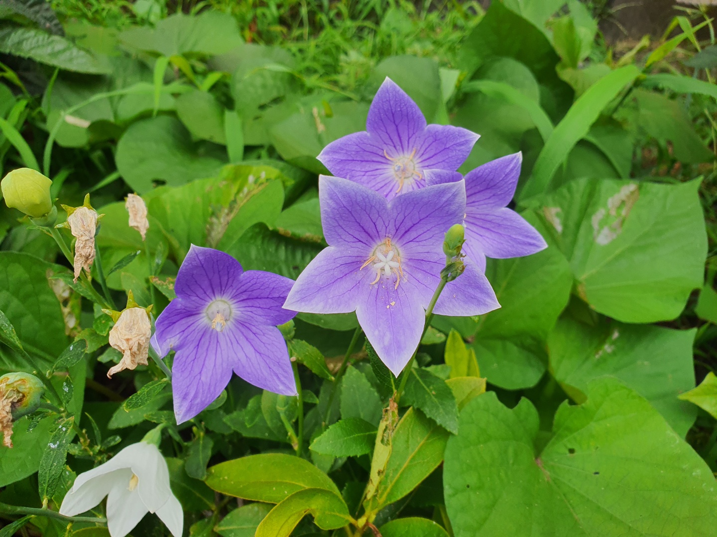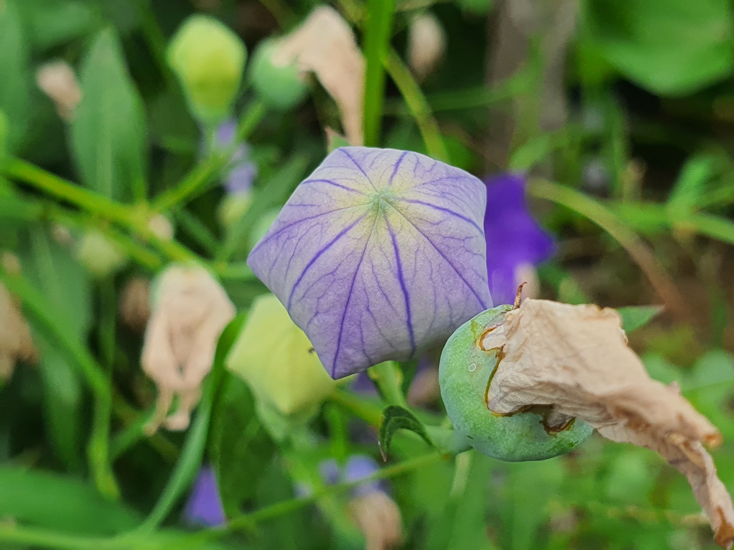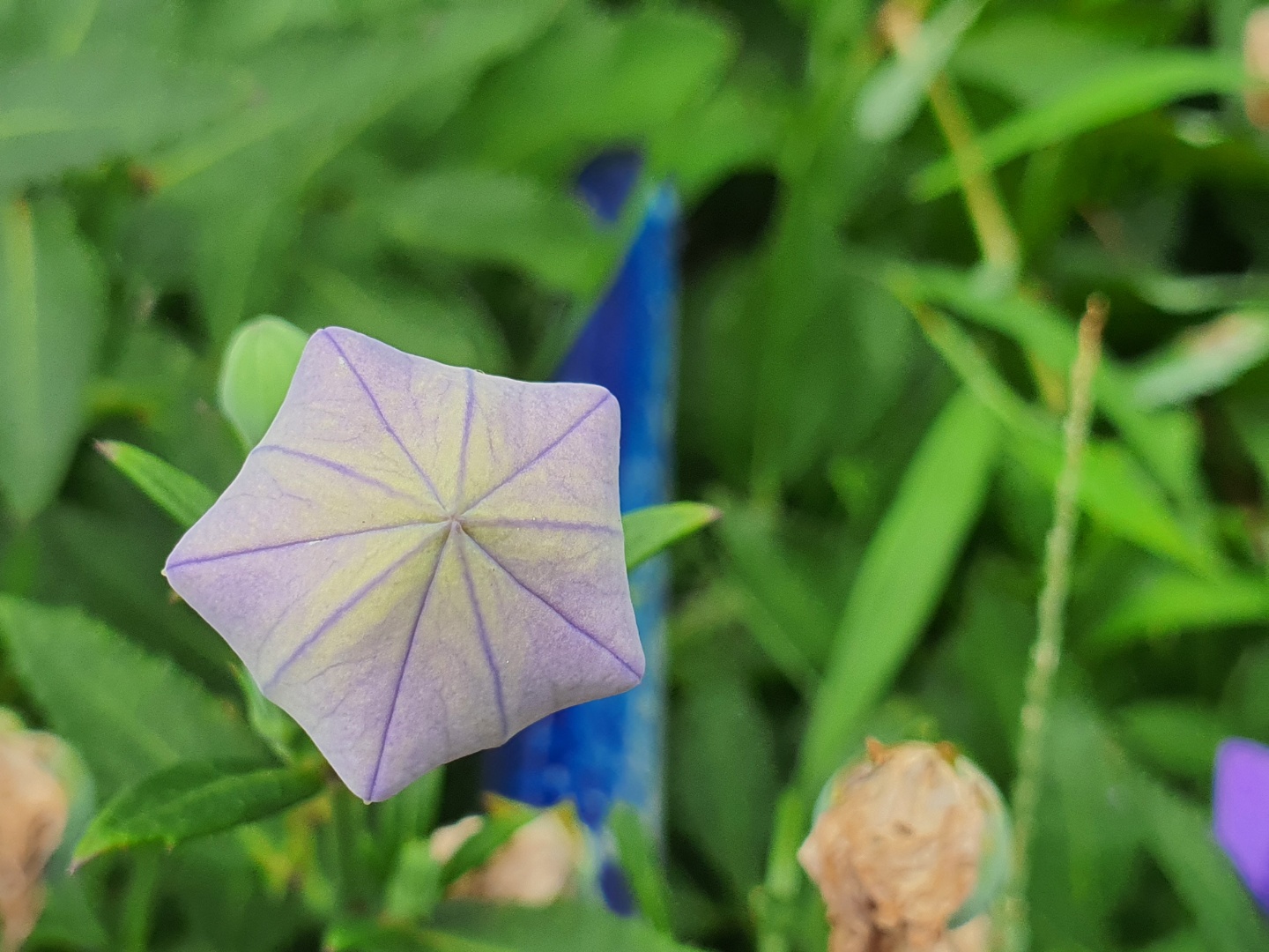 영원한 사랑이라는 꽃말을 가지고 있습니다. 도라지 꽃의 꽃봉오리는 특이하게도 별모양의 오각형 도형입니다. 봉오리가 팽팽하게 부풀어 있다가 어느 날 보니 꽃잎이 바깥으로 펼쳐 있습니다. 손으로 누르면 공기가 바깥으로 나가면서 퐁 소리를 내며 터집니다. 꽃에게 이런 행동하면 안 되겠죠. 눈으로만 봐주세요.