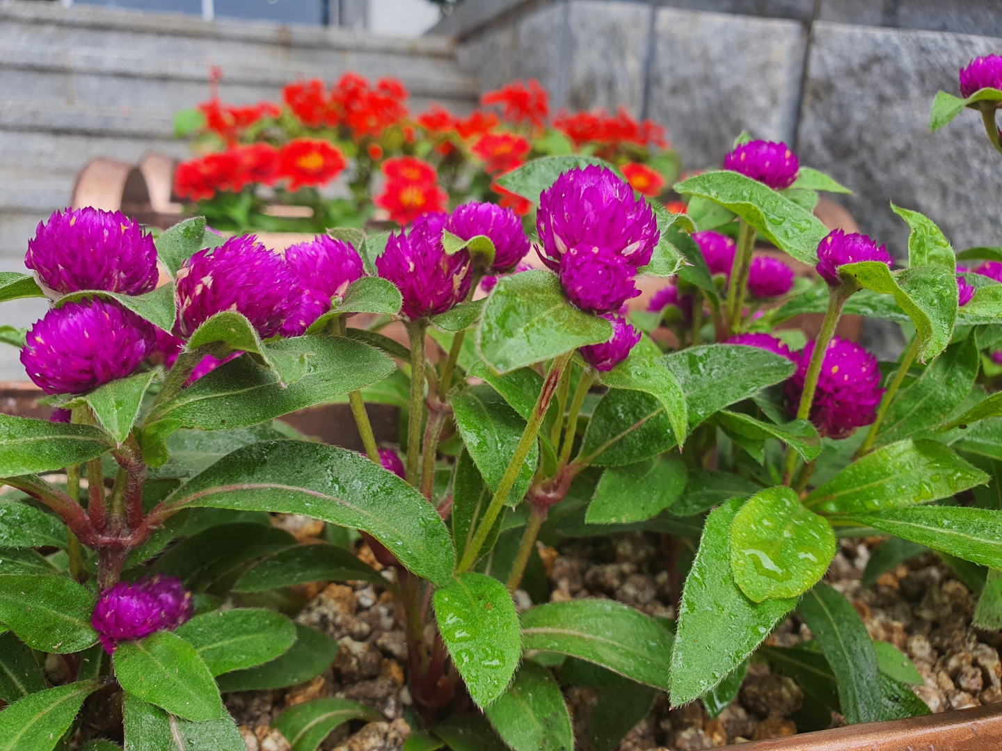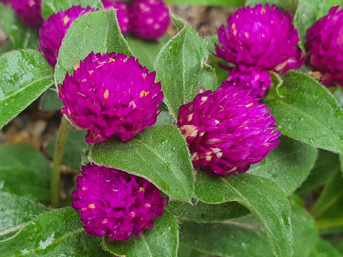 작은공간에도 잘자라는 천일홍은 무성한 잎 사이사이 꽃 봉오리가 올라와 꽃을 핍웁니다. 꽃을 자세히 살펴보면 노란색 별처럼 생긴것이 꽃잎 사이에 있습니다. 꽃이 오래되면 아랫부분부터 연한 갈색으로 변해 갑니다.