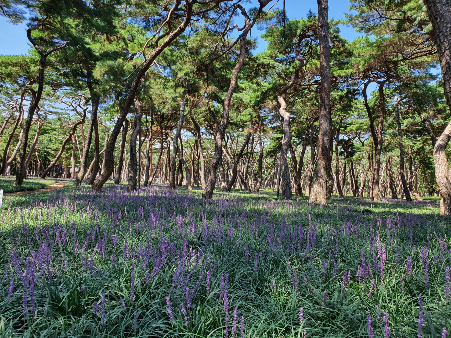 8월에는 경주황성 공원 소나무 아래 맥문동 꽃이 유명합니다. 하지만 올해는 가뭄으로 인해 예전에 비해 꽃이 많이 피지 않아 아쉬웠습니다.