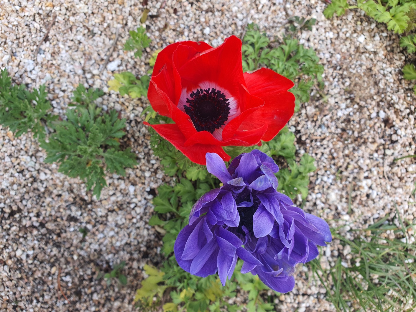 일주일 정도 지나니 꽃대가 쑥 올라오고 꽃봉오리가 점점 벌어진것을 알 수 있습니다. 비 온 뒤라 꽃대에 흙이 묻어 있습니다. 빨간색을 홑꽃 아네모네고 보라색을 겹아네모네입니다.