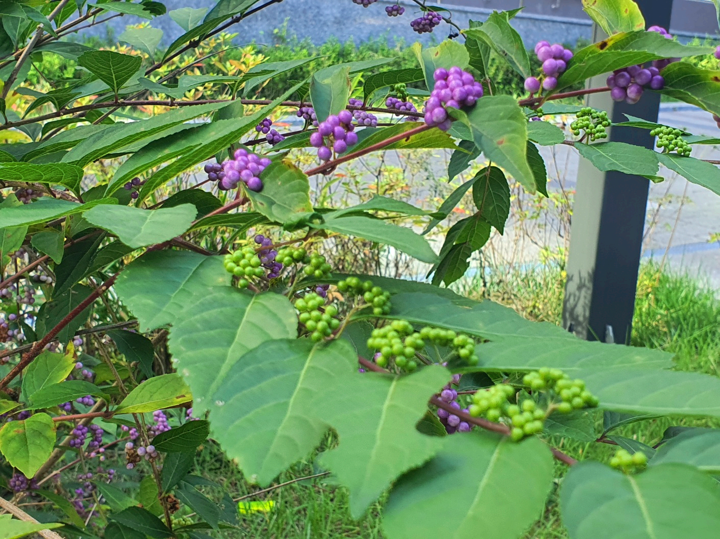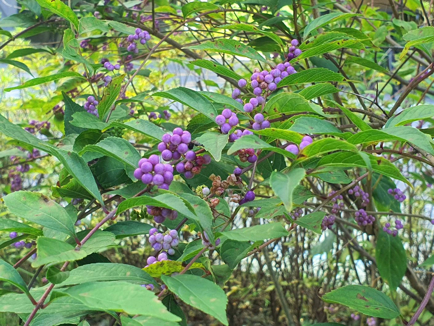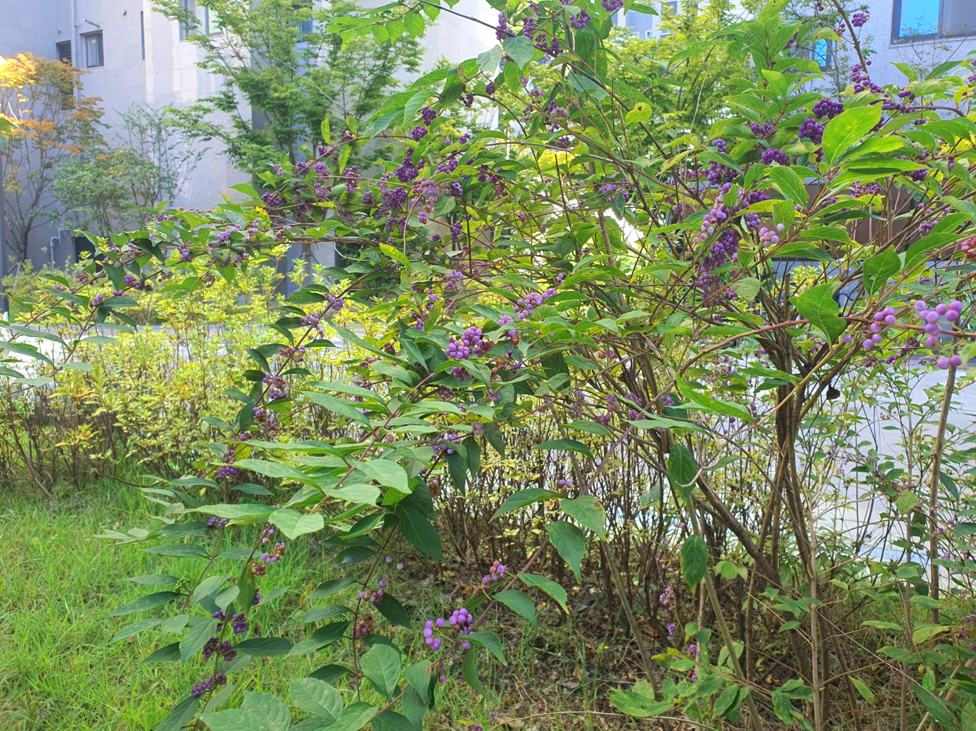사진에서 보듯이 초록색의 열매들이 옹기종기 붙어 가을이 되면 보라색으로 변해 갑니다. 모르고 지나치다 보라색으로 물들면 비로서 사람들의 관심을 받게 됩니다. 간혹 우윳빛 하얀 열매가 열리는 나무도 있는데 이것은 흰 좀 작살나무입니다.