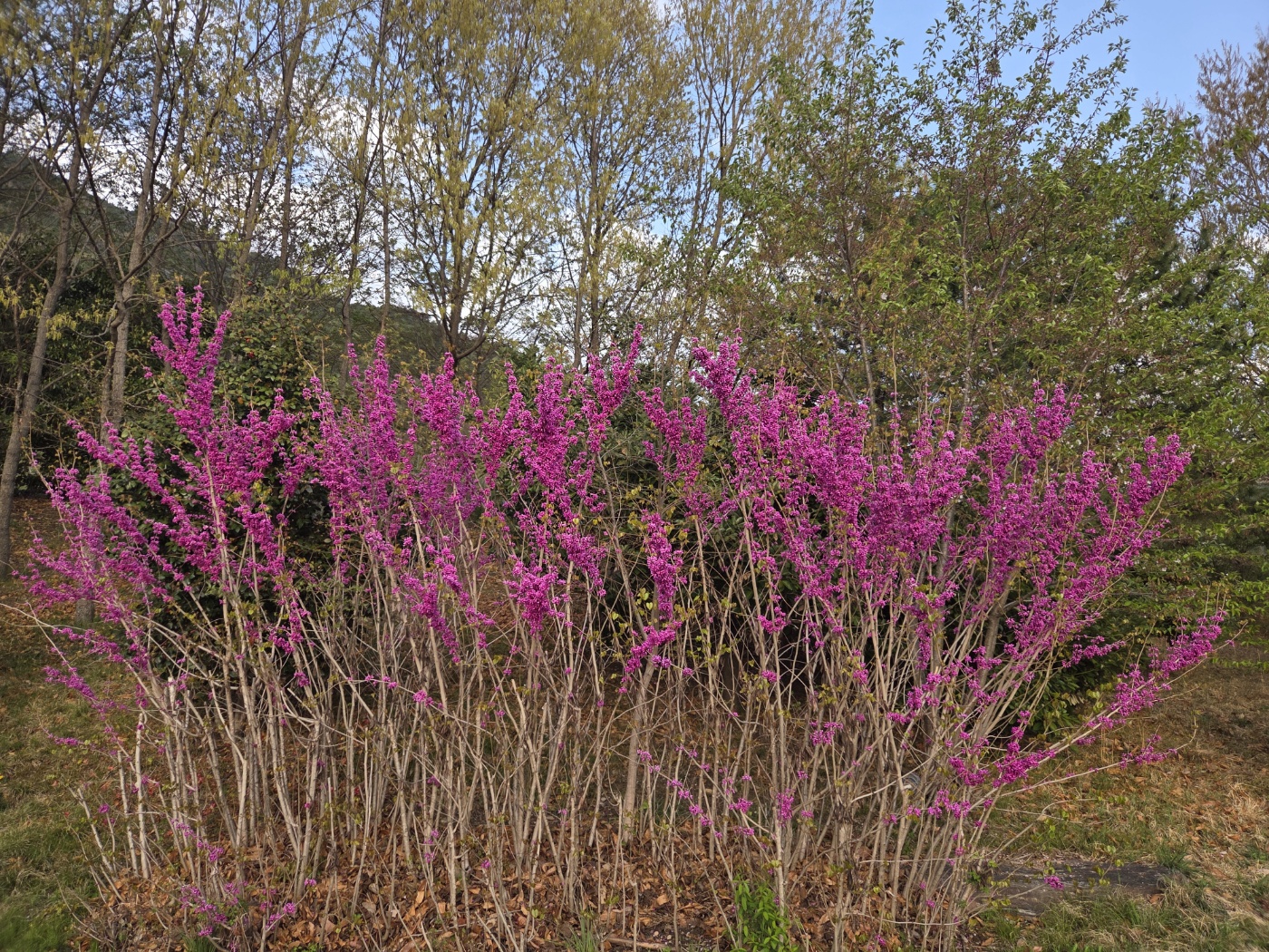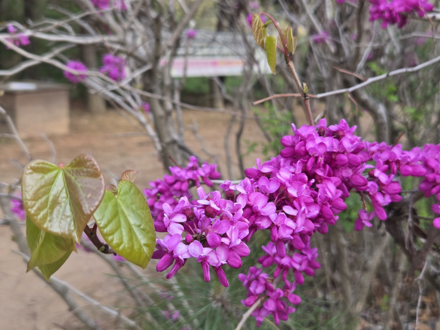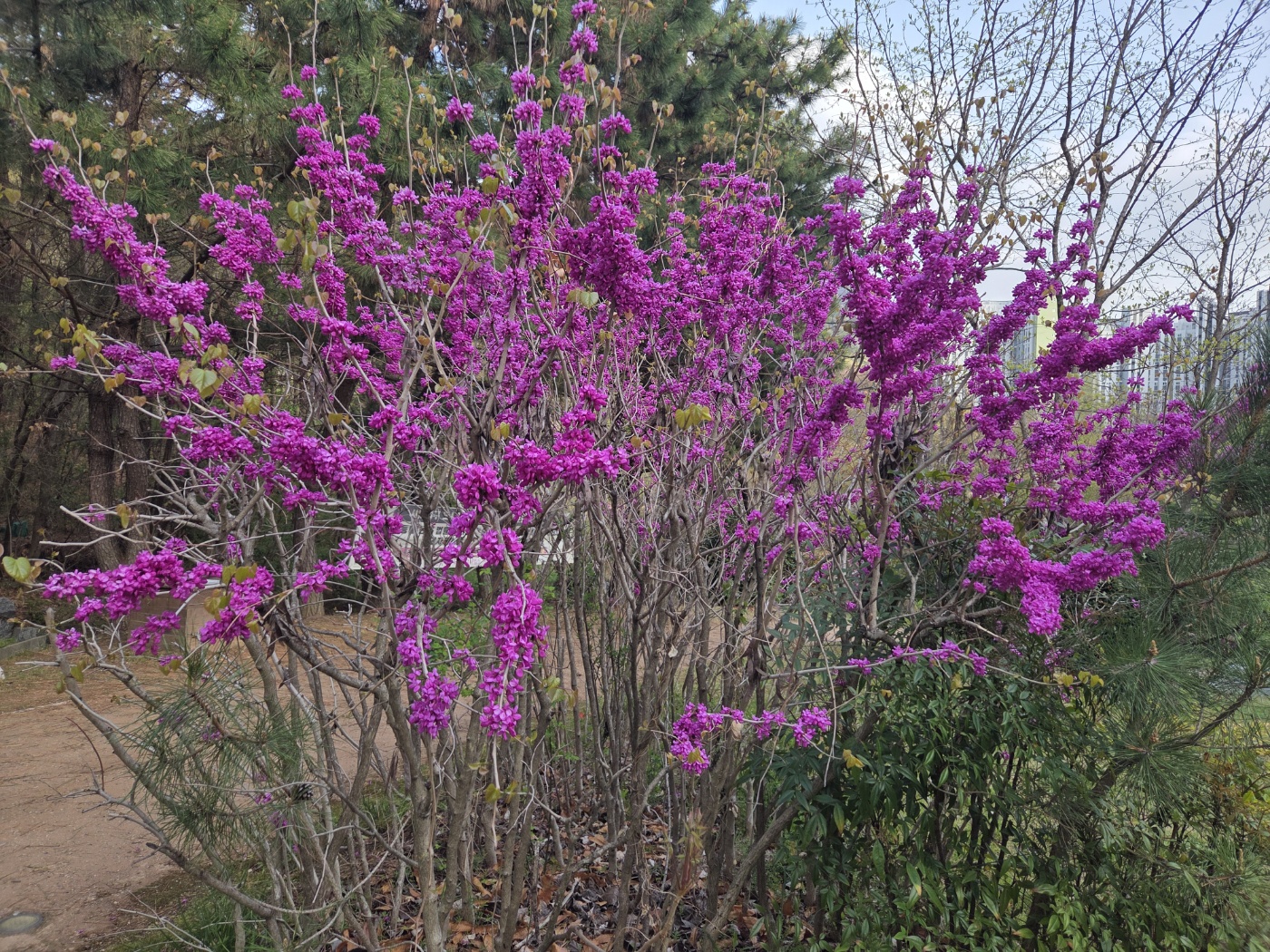 박태기나무는 꽃이 먼저 피고 그다음에 잎이 납니다. 꽃과 동시에 몇몇 잎들이 함께 피어 있는 모습입니다. 박대기 나무는 한그루만 심는 것보다 여러 나무를 나란히 심어 제대로 봄을 느껴 보는 것이 좋을 것 같습니다. 정원이 넓다면 담장에 울타리처럼 심어도 예쁠 것 같습니다. 제가 정원수로 추천하는 나무중 하나입니다. 잠깐의 산책으로 여러 박대기 나무를 만나 봄꽃을 충분히 느꼈습니다.