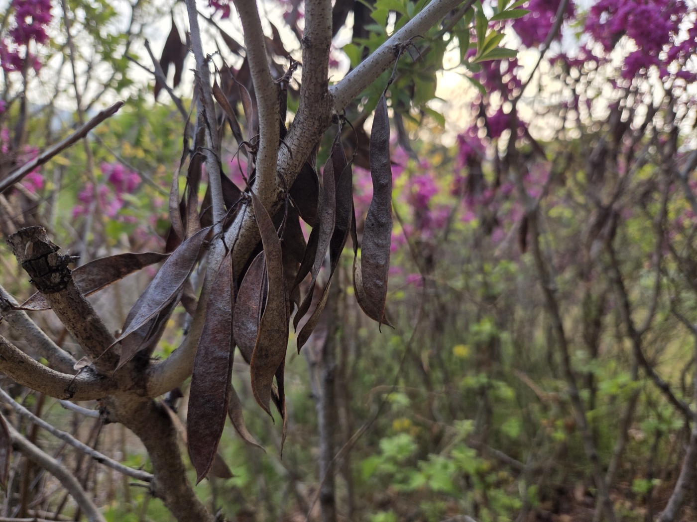 작년에 열렸던 열매가 아직 붙어 있는 상태입니다. 열매를 보니 콩과 식물인 것을 확실히 알 수 있습니다. 열매가 너무 납작해 빈 꼬투리만 매달려 있는 것 같은데 만져보면 아주 작은 알맹이가 만져집니다. 콩처럼 큰 알맹이가 아니고 너무 작은 알맹이라 보기에는 없는 것처럼 보입니다.