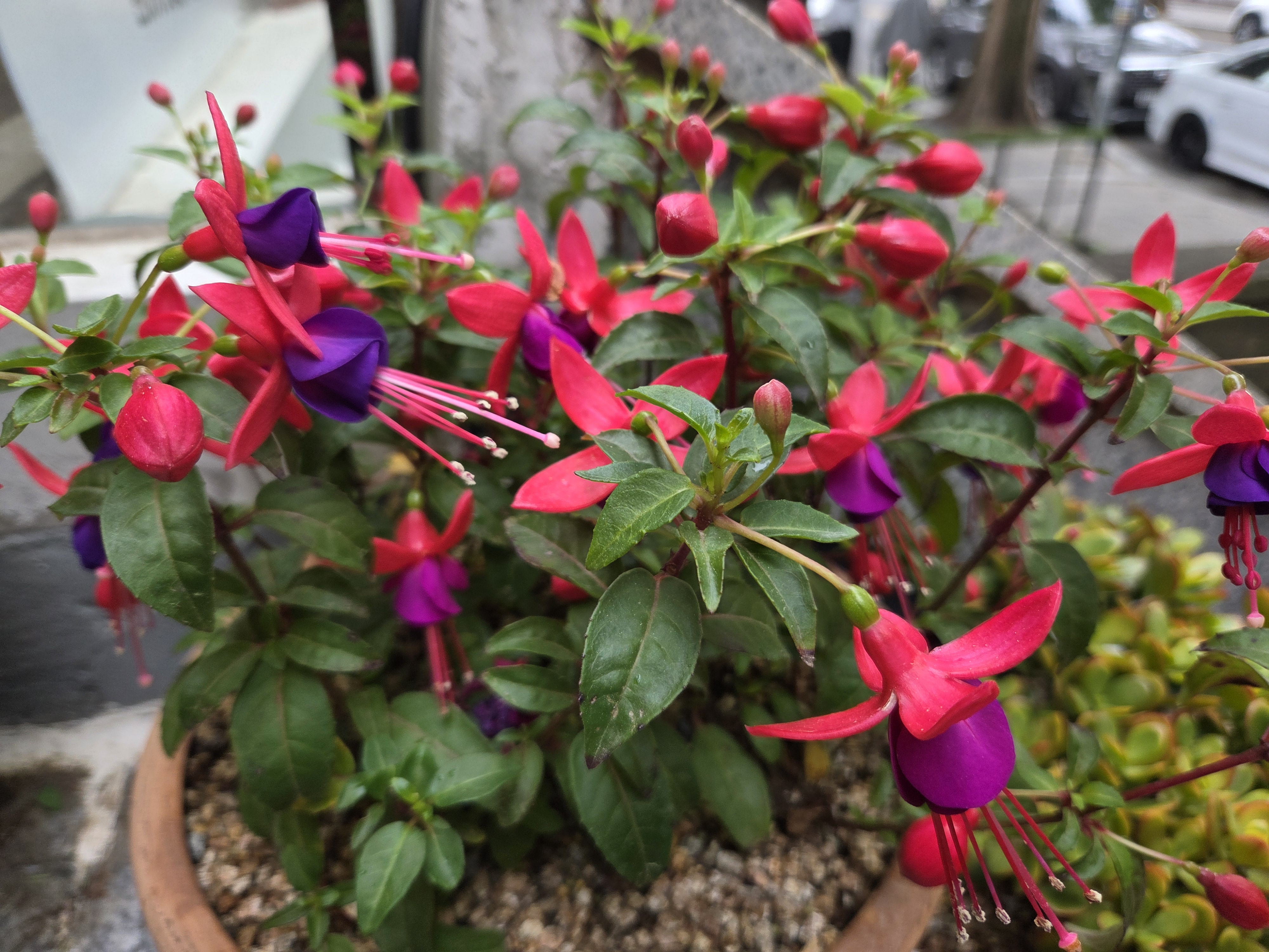 푸크시아는 통통한 꽃봉오리로 있다가 빨간색꽃받침이 활짝 열리고 그 안쪽에 자주색의 꽃잎과 대비를 이룹니다. 두번째 사진을 보면 선명한 붉은 색 꽃받침 안에는 진한 보라색 꽃잎과 붉은 수술이 보입니다. 푸크시아는 흰색 꽃받침에 여린 분홍색 꽃잎이 있기도 합니다. 좋아하는 색을 선택해 키우보면 좋을 것 같습니다.