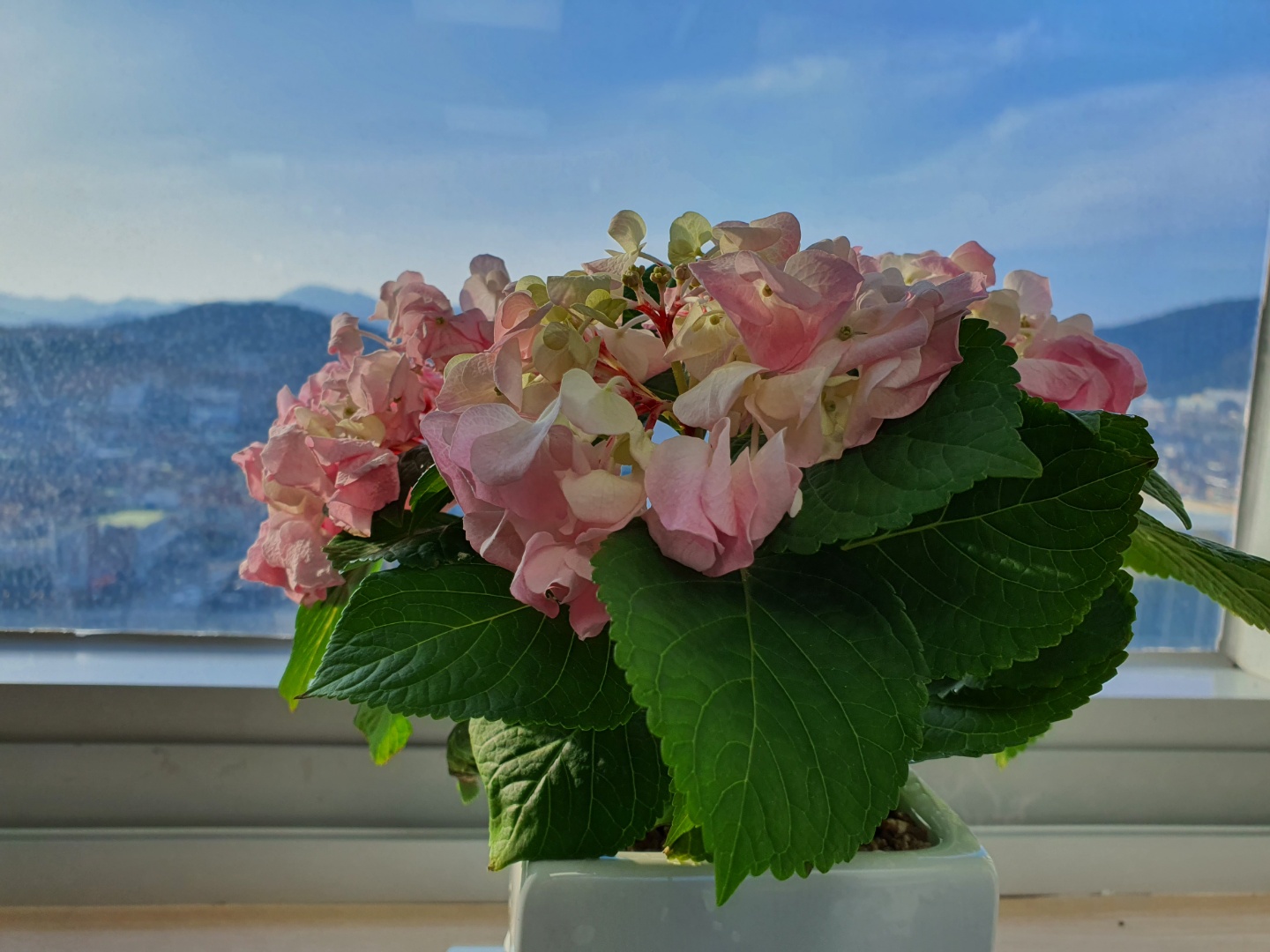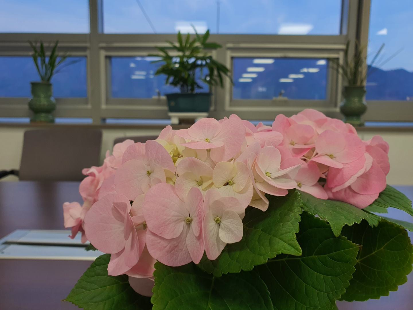 꽃집을 지나가면 화려한 수국들이 시선을 끌어당깁니다. 수국은 향기가 없는 대신 꽃의 풍성함과 화려한 색깔로 사람들의 관심을 모으고 있습니다. 이번 봄에도 수국의 유혹에 넘어갑니다. 세송이가 활짝 핀 수국을 12,000원에 구입했습니다. 사무실에서 키워야 해서 꽃이 활짝핀 수국을 골랐습니다. 그늘에서 키우다 가끔 창가로 이동해 주고 있습니다.