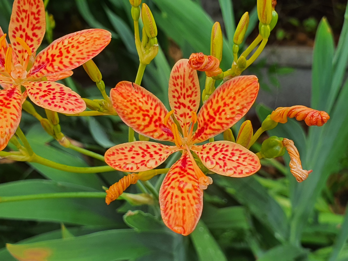 그리고 사진 오른쪽에서 보듯이 꽃이 활짝핀후 수정이 되면 꽃잎들이 스크루바 아이스크림처럼 베베 꼬여지는 모습이 신기합니다. 범부채는 9월 , 10월쯤 열매를 맺지만 씨앗 자연발아율이 낮아 모종을 구입해 심는 것이 더 좋습니다.