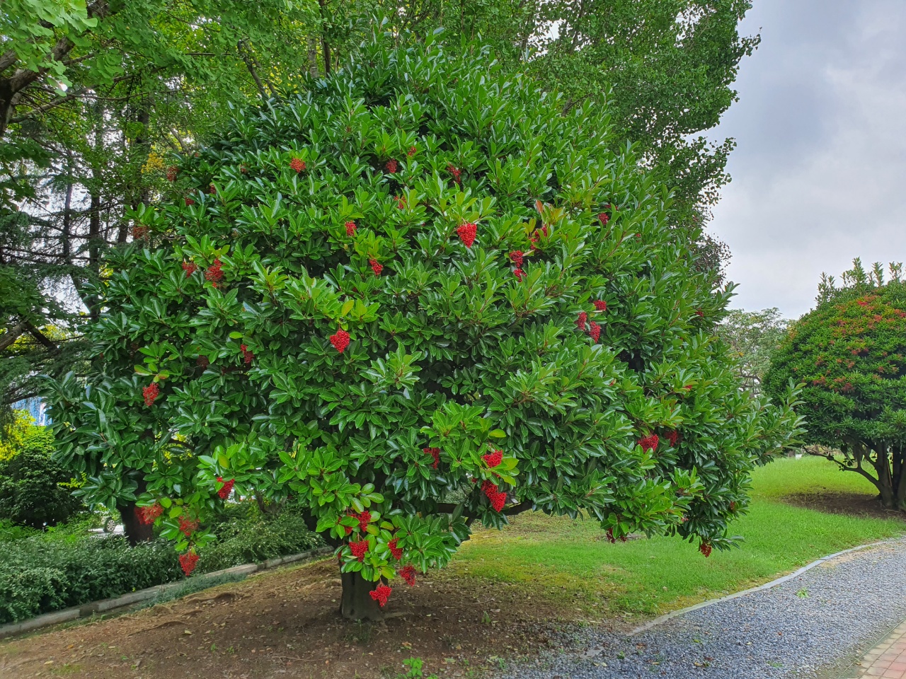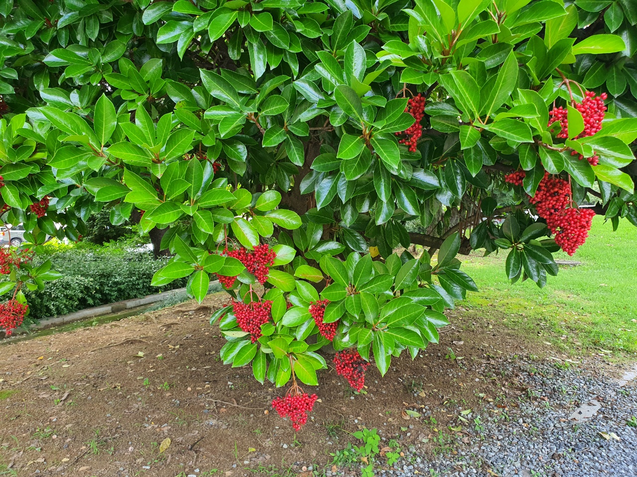 봄철 예쁜 꽃들을 피우던 나무들이 가을이 되니 또 다른 모습을 보여주고 있습니다. 자주 보지 못한 나무인데 빨간 열매들이 주렁주렁 달려 있습니다. '아왜나무'라고 합니다.